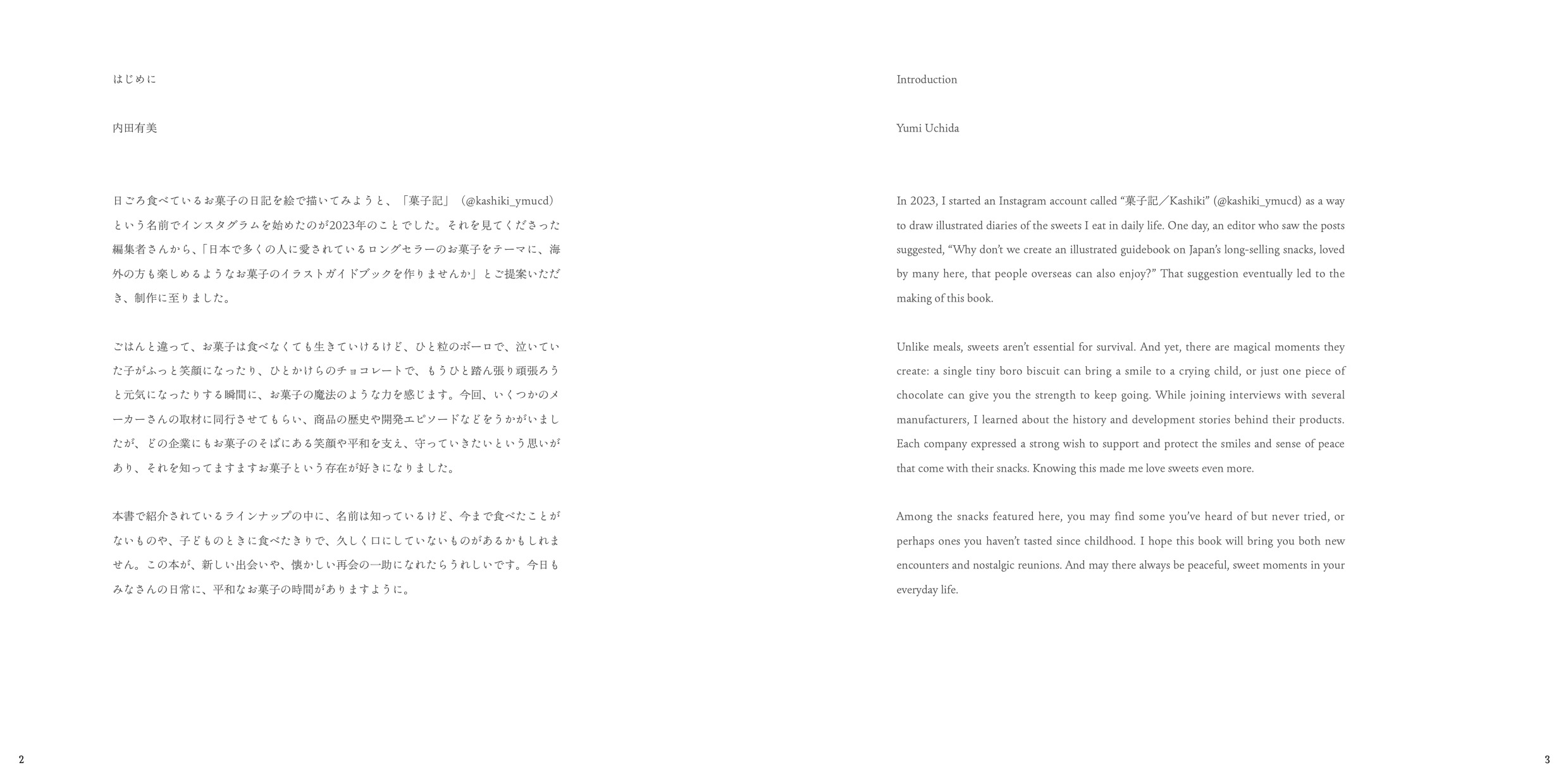 日ごろ食べているお菓子の日記を絵で描いてみようと、「菓子記」(@kashiki_ymucd)という名前でインスタグラムを始めたのが2023年のことでした。それを見てくださった編集者さんから、「日本で多くの人に愛されているロングセラーのお菓子をテーマに、海外の方も楽しめるようなお菓子のイラストガイドブックを作りませんか」とご提案いただき、制作に至りました。