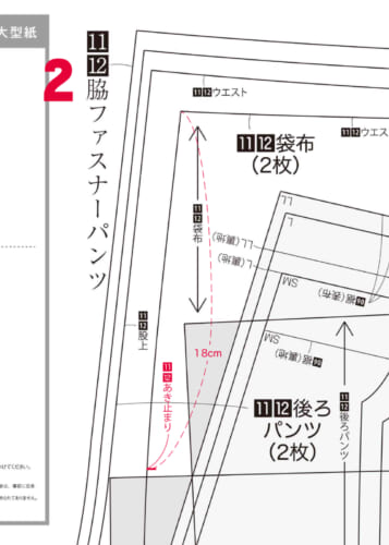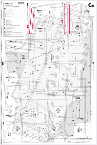 実物大型紙C面「11 12 脇ファスナーパンツ」の型紙の