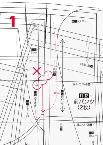 ★誤り1の拡大図(線のズレ/ウエストから下に18㎝の位置が正しい)