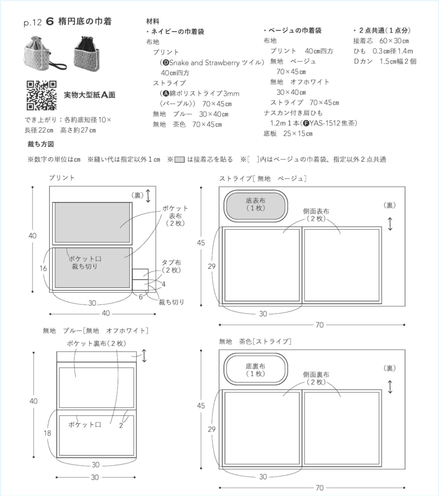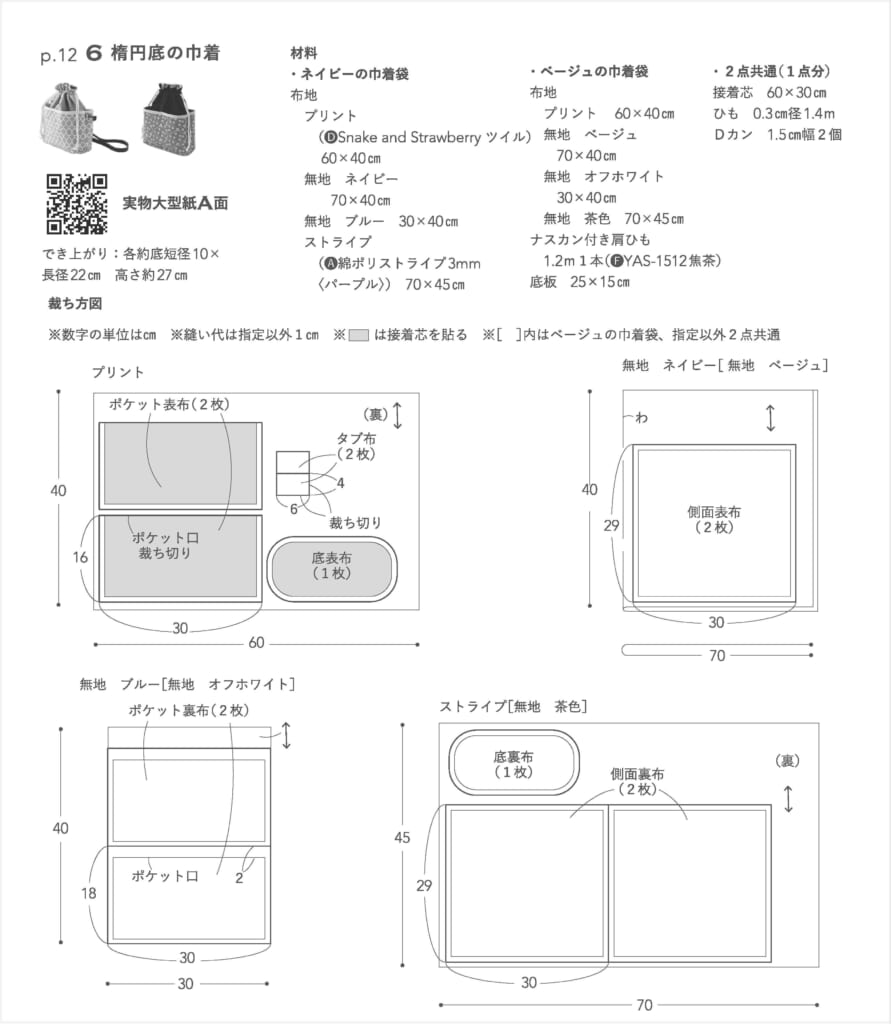 『商用OK!雑貨屋さんに売っていそうなワザありデザインのバッグと小物』48ページの材料(材料の生地名や用尺)と裁ち方図(底表布はプリント生地で裁断)に誤りがありました。